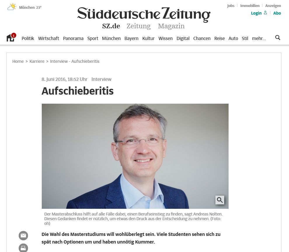 Andreas Nolten wurde von der Süddeutschen Zeitung zur „Aufschieberitis“ bei der Wahl des richtigen Master-Studiengangs befragt und den Folgen, die Entscheidung zu lang vor sich her zu schieben.